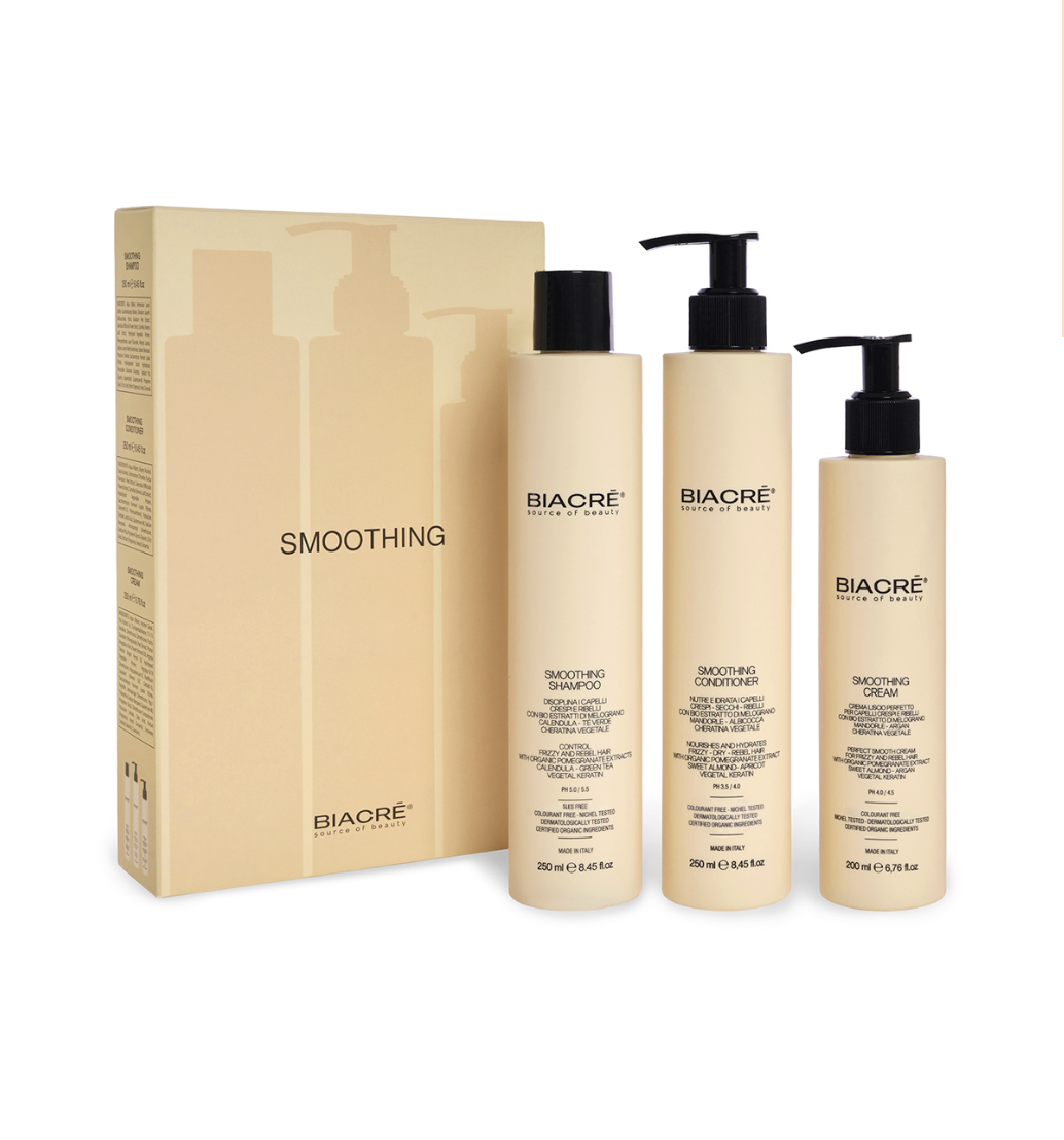 Набор ухода BIACRÈ SMOOTHING создан специально для укрощения пушистых, торчащих и непослушных волос, делая их гладкими, мягкими и естественно блестящими. Шампунь, кондиционер и разглаживающий крем для волос в составе набора работают в синергии: восстанавливают оптимальный уровень увлажнения волос, разглаживают волокна и помогают устранить повреждения, одновременно уменьшая пушистость. Органический экстракт граната, алоэ, экстракт зелёного чая, миндальное молочко, масла абрикоса и арганы, а также растительный кератин создают интенсивно питающий, увлажняющий и разглаживающий комплекс, который придаёт волосам здоровый вид и делает их более послушными. Набор идеально подходит для ежедневного использования, когда вы хотите добиться гладких, ухоженных и легко контролируемых волос.